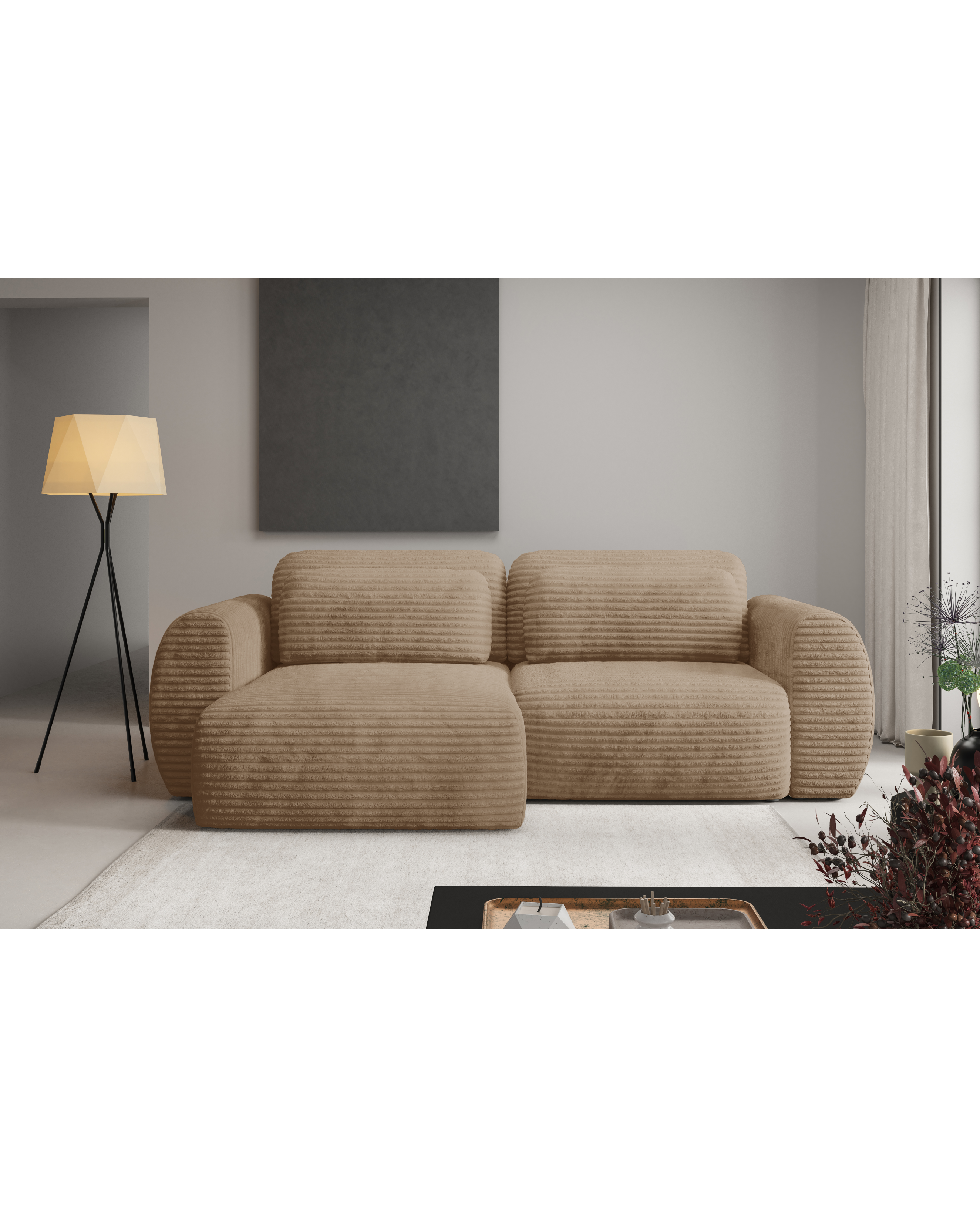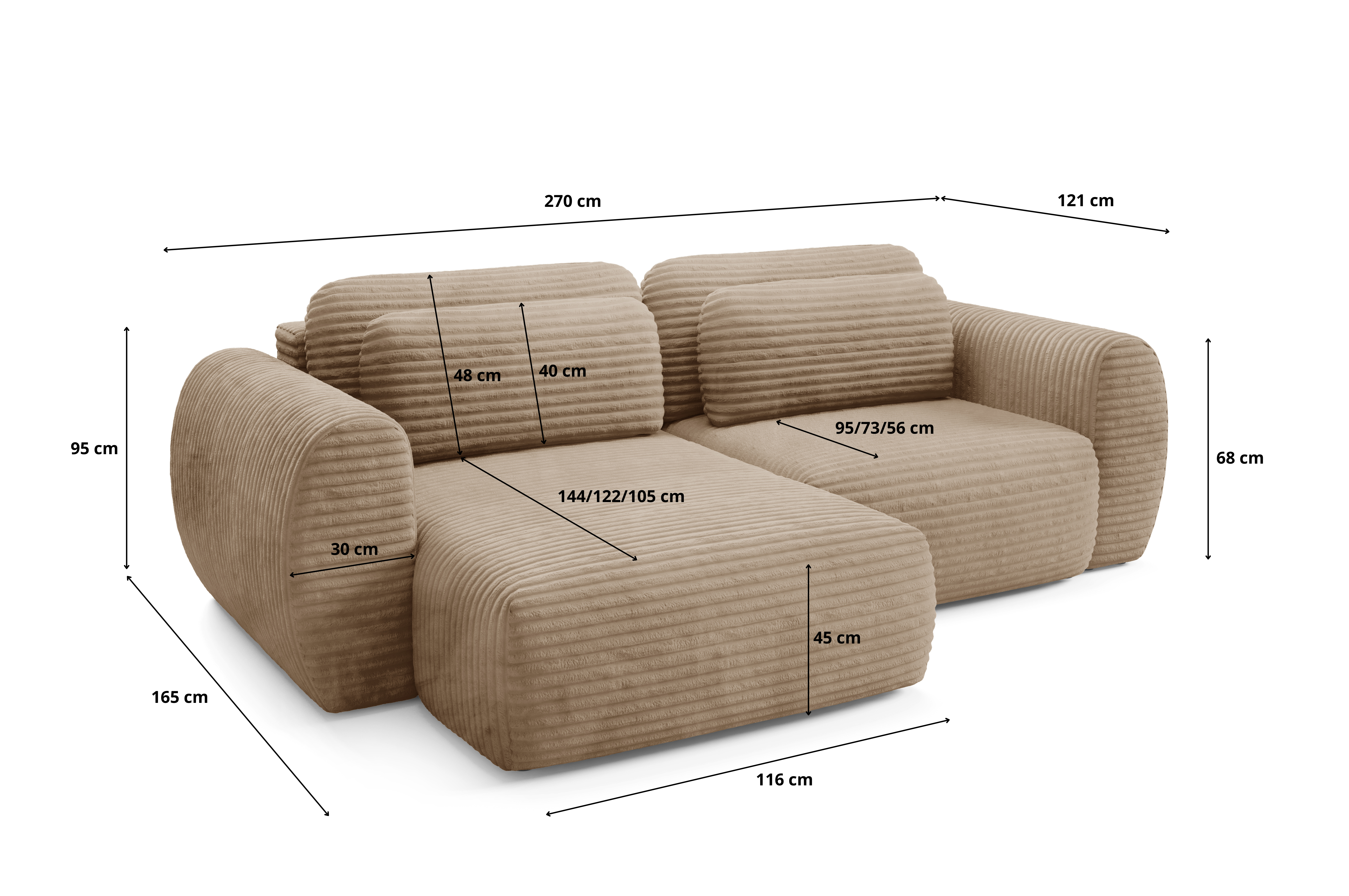 Narożnik CLOUD L Premium to elegancki i funkcjonalny mebel z kolekcji Intenso Line, który doskonale łączy nowoczesny design z wyjątkowym komfortem użytkowania. Dzięki funkcji spania z powierzchnią 200 × 140 cm z łatwością przekształcisz narożnik w wygodne łóżko dla gości, a dwa pojemniki na pościel zapewnią dodatkowe miejsce do przechowywania i utrzymanie porządku w salonie. Wysokiej jakości wypełnienie siedziska i oparcia – sprężyna falista typu B w połączeniu z pianką T30 oraz pianką wysokoelastyczną HR – gwarantuje sprężystość, trwałość i komfort premium na co dzień. Mechanizm rozkładania DL automat sprawia, że rozkładanie narożnika jest szybkie i bezproblemowe, a tapicerowany tył pozwala ustawić mebel w dowolnym miejscu w pokoju, nawet w jego centralnej części.