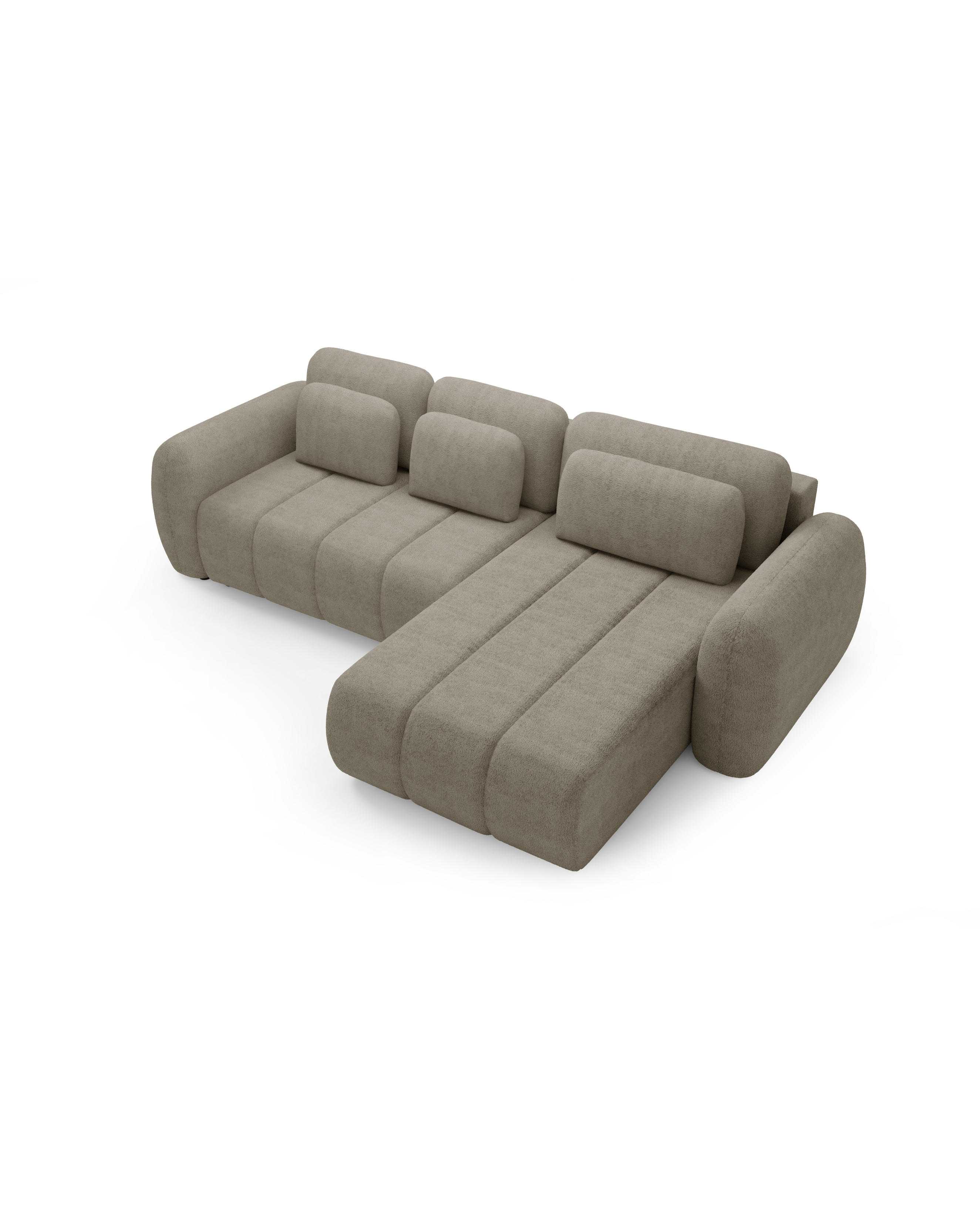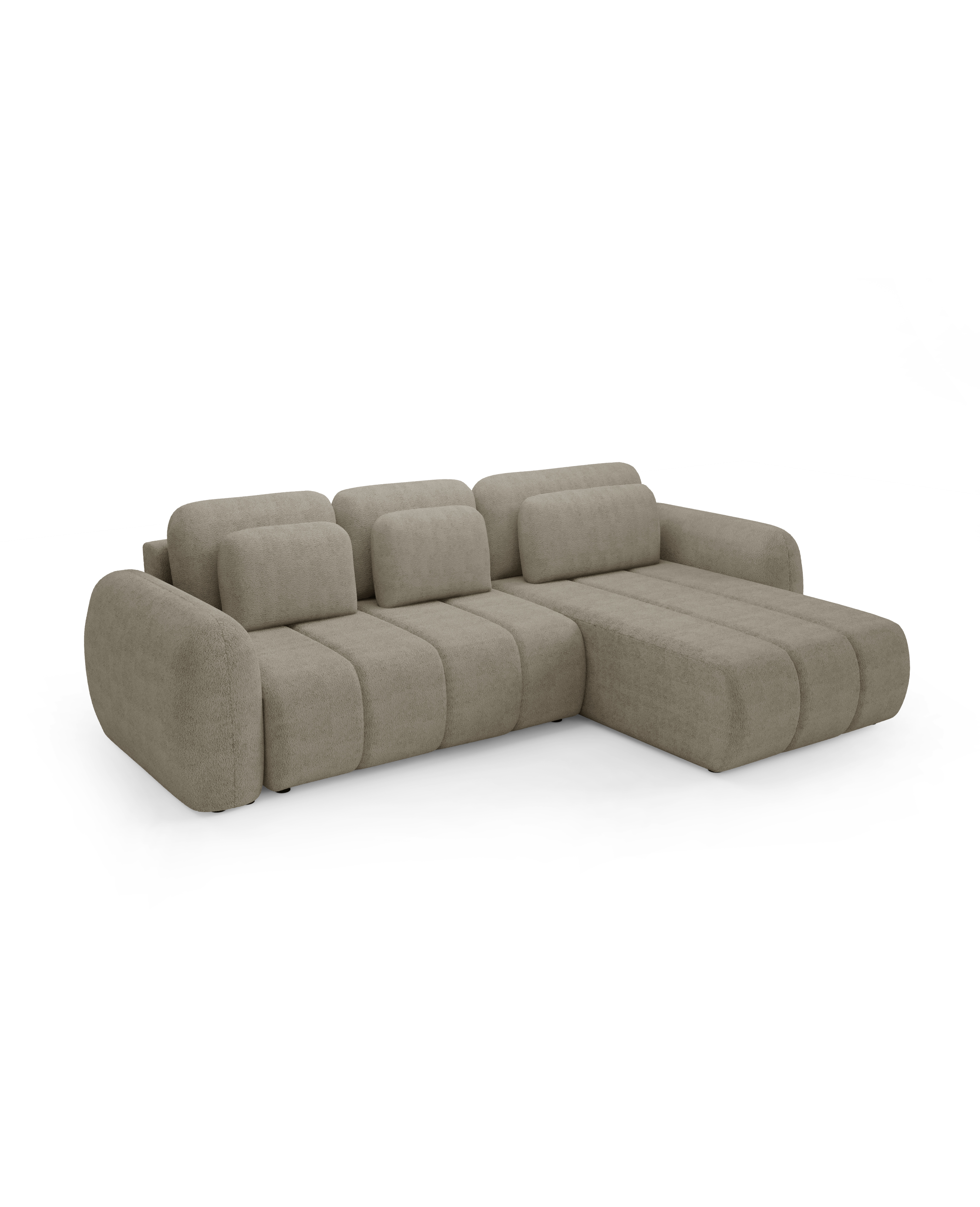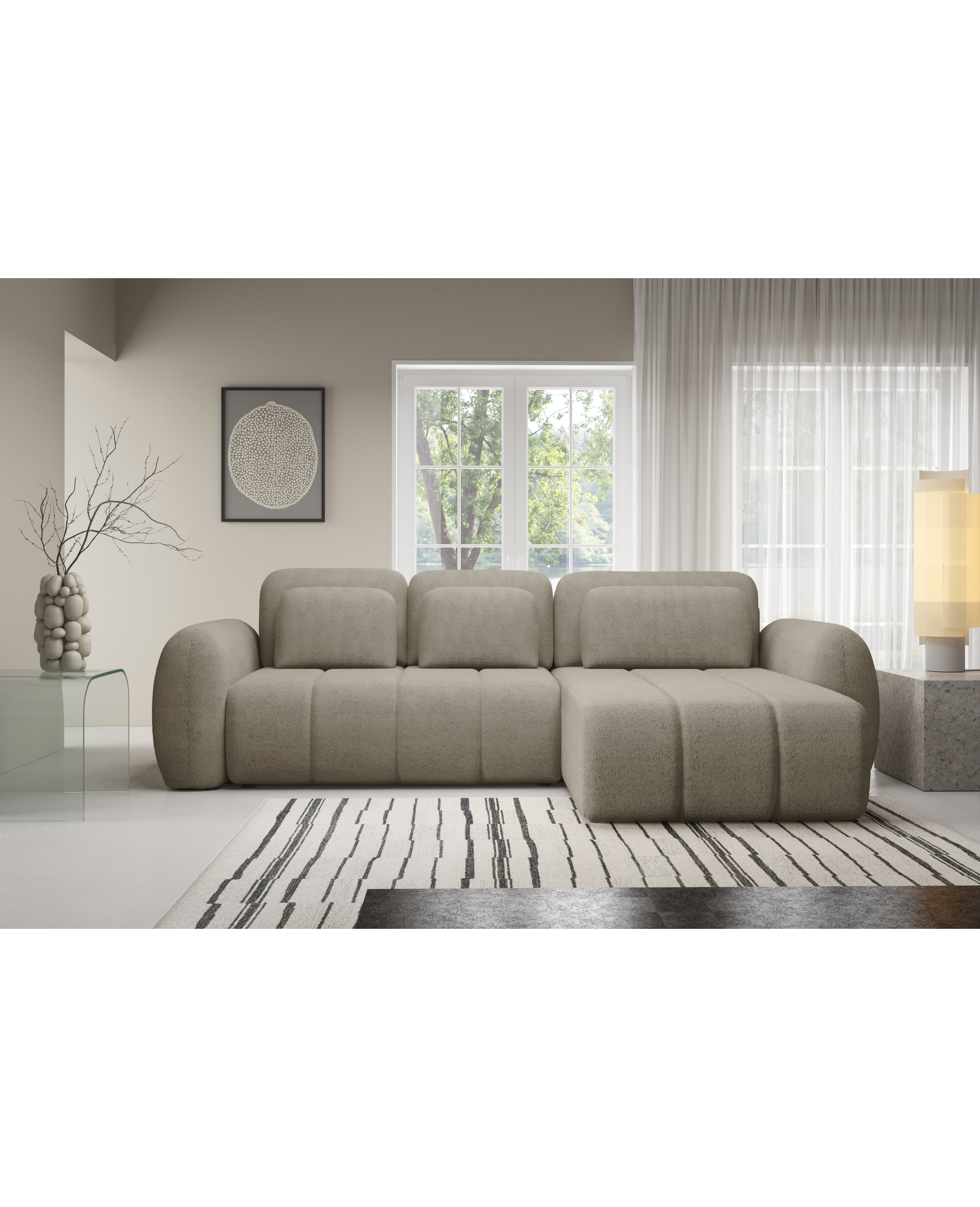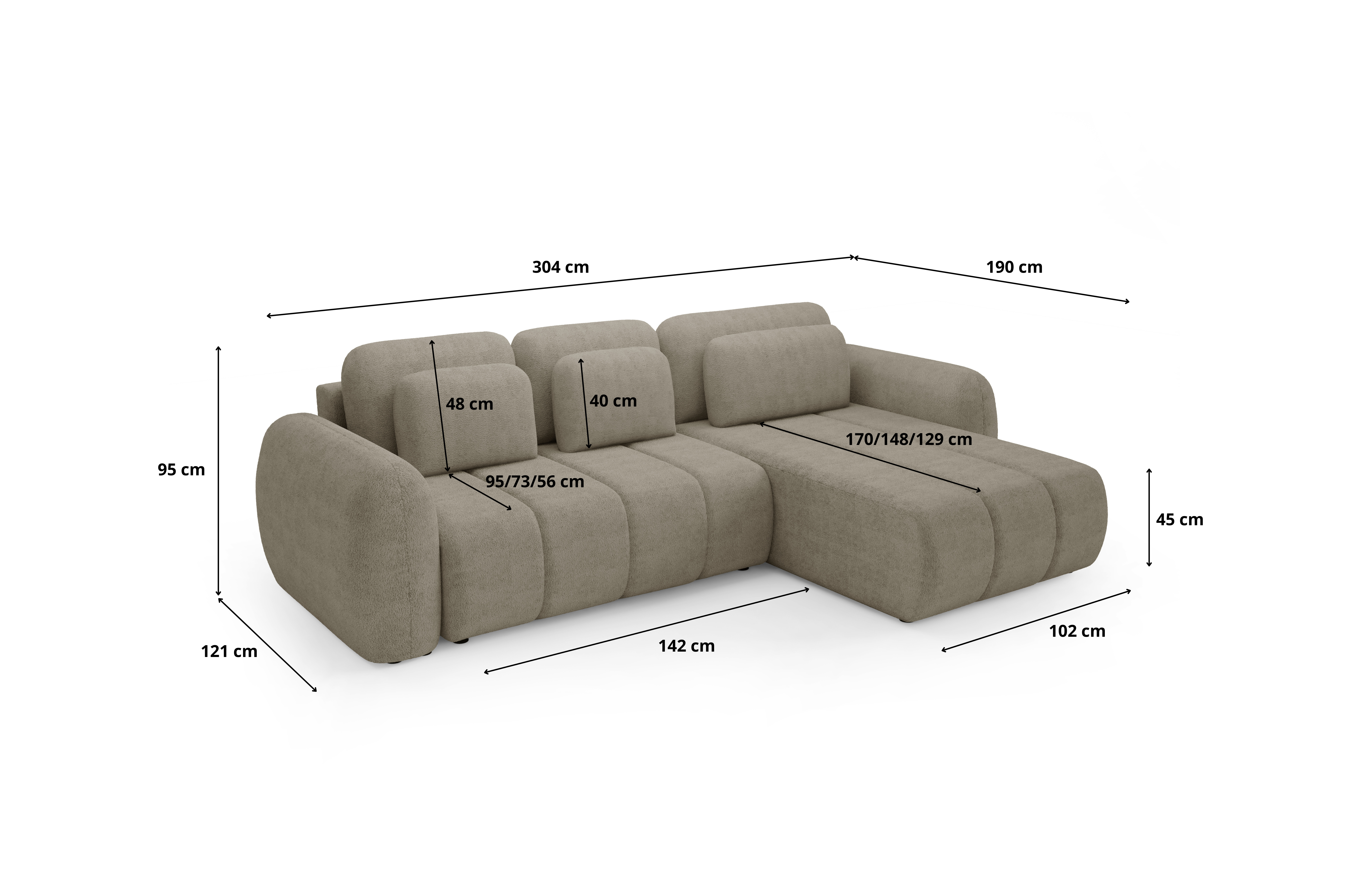 Komfort siedzenia gwarantuje wypełnienie premium oparte na sprężynie falistej typu B oraz podwójnym układzie pianek poliuretanowych, co zapewnia sprężystość, trwałość i wygodę użytkowania na lata. Tapicerowany również z tyłu prezentuje się doskonale z każdej strony, dzięki czemu można ustawić go nawet w centralnej części salonu. Szeroka gama kolorów tkaniny Quelle bouclé pozwala dopasować narożnik do aranżacji nowoczesnych i klasycznych, czyniąc z niego idealne serce domowej przestrzeni.