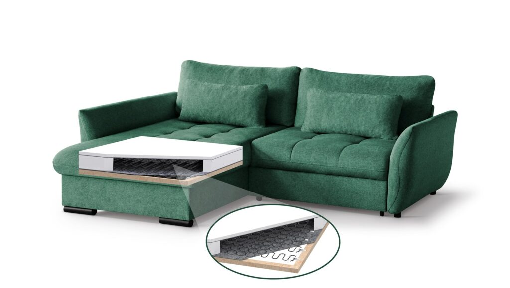 - Sprężyny faliste + sprężyny bonell na siedzisku – zdecydowanie podnoszą komfort wypoczynku i przedłużają żywotność mebla