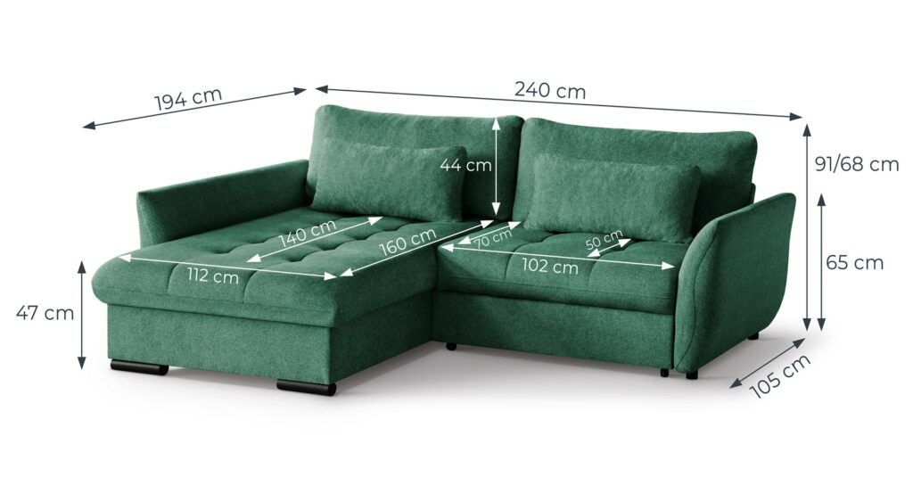- Tył obity tym samym materiałem – dzięki temu narożnik może stać wolno i godnie prezentować się na środku salonu