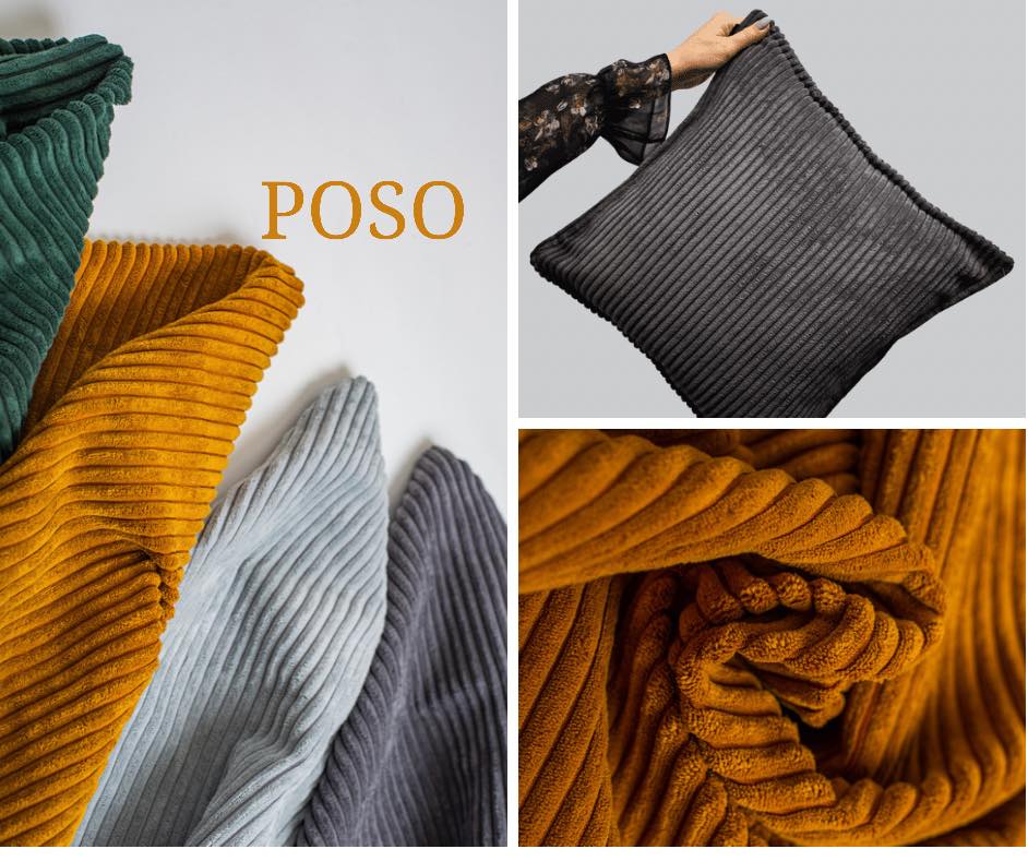 Tkanina POSO to ultramiękki sztruks w grube prążki. Kolorystyka POSO została idealnie dopasowana do najmodniejszych kolorów z kolekcji KRONOS, co pozwala tworzyć niezwykłe kombinacje! Kolekcja POSO pięknie prezentuje się zarówno na meblach, jak również na poduszkach, legowiskach dla zwierząt, elementach dekoracyjnych.