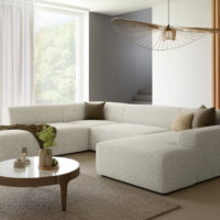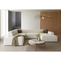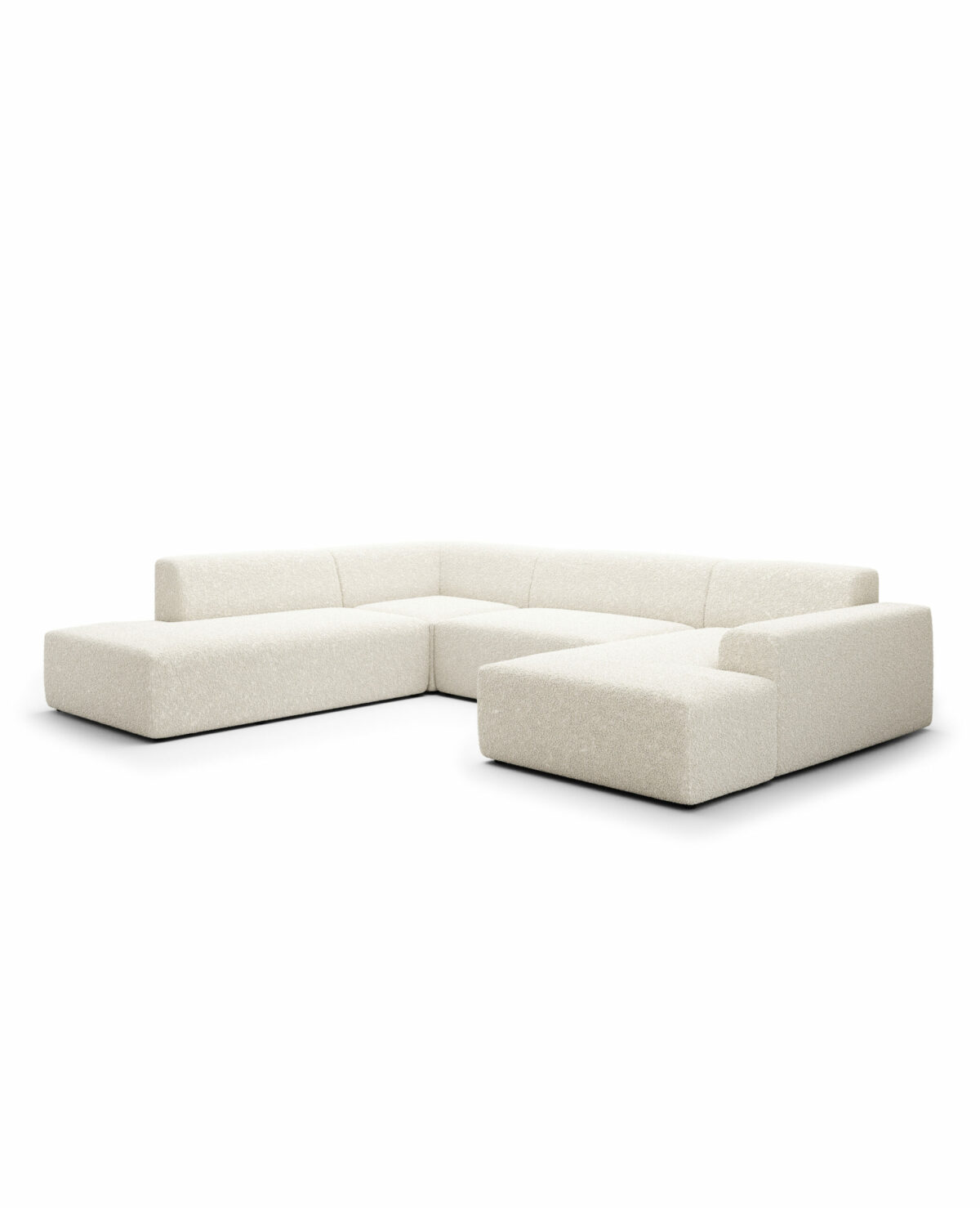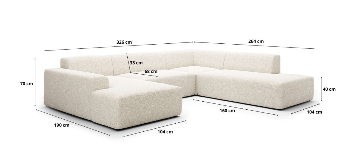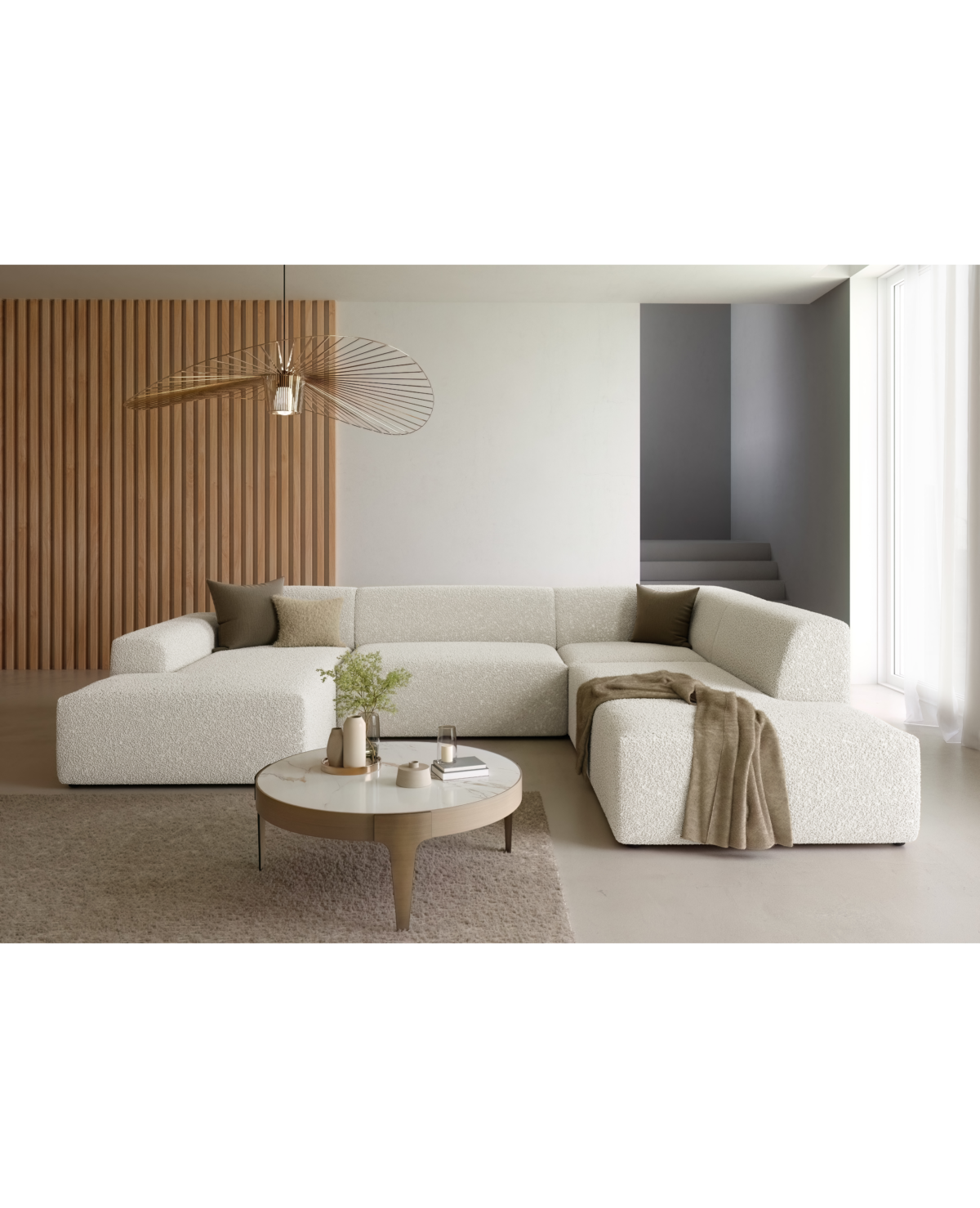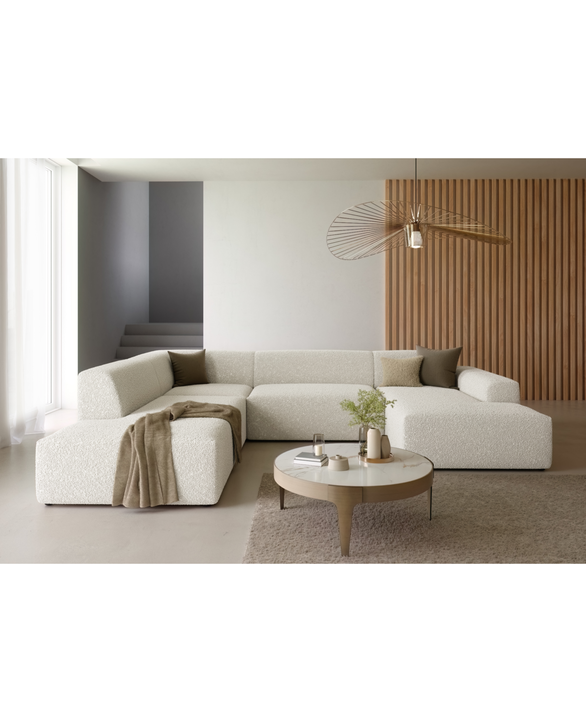 Narożnik MODU U z kolekcji modułowej to idealne rozwiązanie dla osób ceniących elastyczność aranżacji i wysoki komfort użytkowania. Dzięki modułowej budowie możesz samodzielnie dopasować jego układ do swojego salonu, tworząc przestrzeń idealną do spotkań, relaksu czy rodzinnego odpoczynku. Tapicerka z miękkiej i przyjemnej w dotyku tkaniny bouclé („baranek”) nadaje narożnikowi wyjątkowy charakter, łącząc elegancję z przytulnością. Solidna konstrukcja i staranne wykończenie sprawiają, że mebel prezentuje się efektownie z każdej strony, a bogata paleta kolorów pozwala dopasować go do wnętrz nowoczesnych i klasycznych. Narożnik MODU U to połączenie nowoczesnego designu, praktyczności i wygody, które uczyni Twój salon sercem domu.