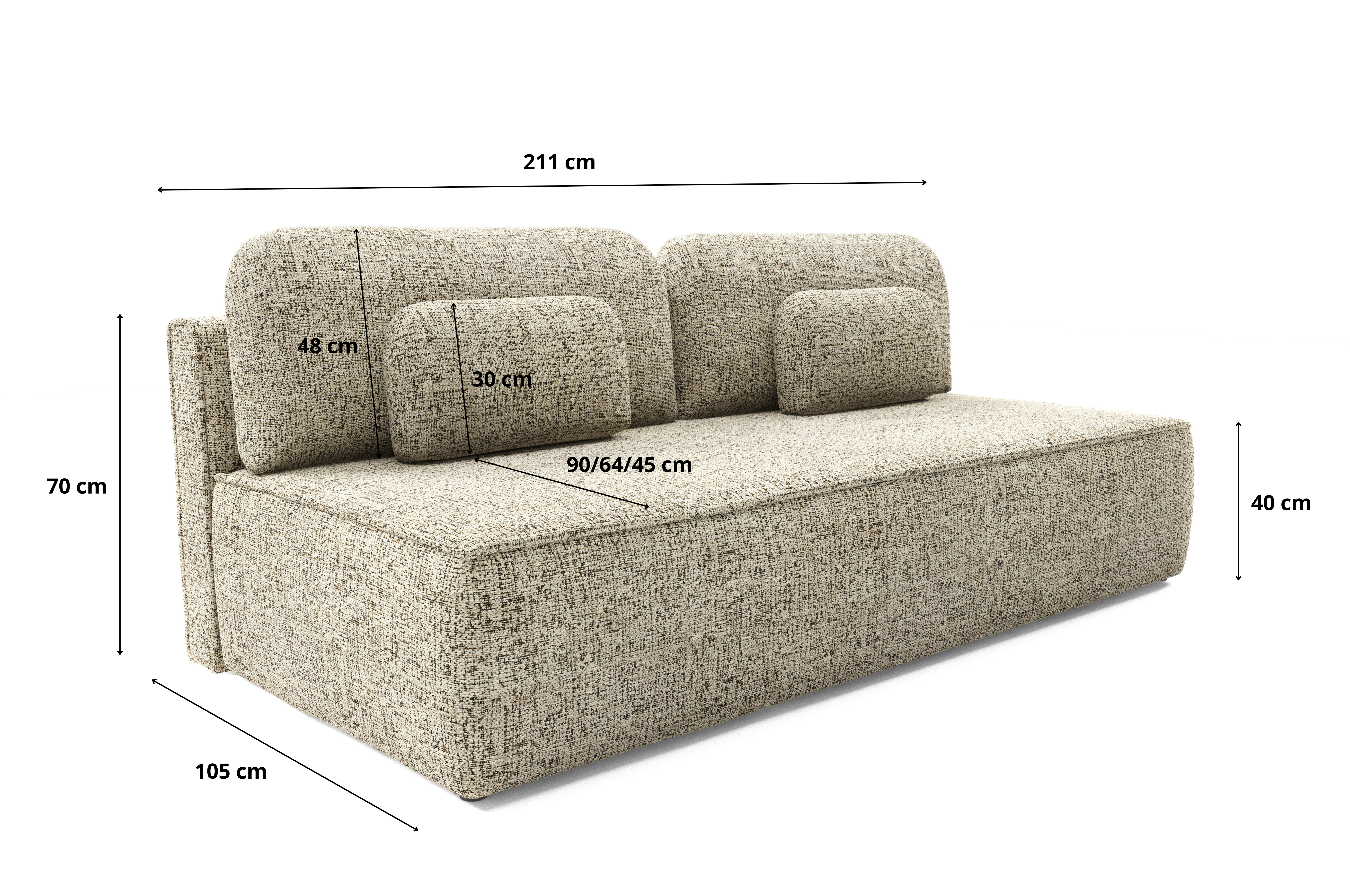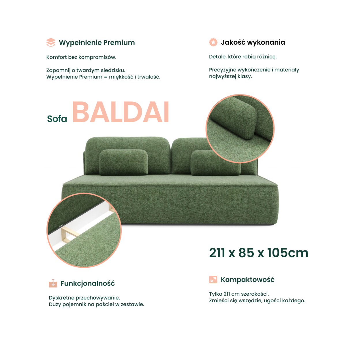 Szerokość 211 cm sprawia, że Baldai to mebel niezwykle ustawny. Z łatwością wkomponujesz go w niewielkie mieszkanie w bloku, apartament typu studio czy domowe biuro, które wieczorami zmienia się w strefę relaksu. Mimo swoich zgrabnych wymiarów, sofa oferuje zaskakująco dużo miejsca do siedzenia, nie przytłaczając przy tym optycznie pomieszczenia.